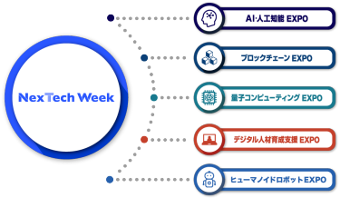 <AI><ブロックチェーン><量子コンピュータ><ヒューマノイドロボット>の最新テクノロジーと、<デジタル人材>を育成するサービスが出展する5つの展示会で構成。