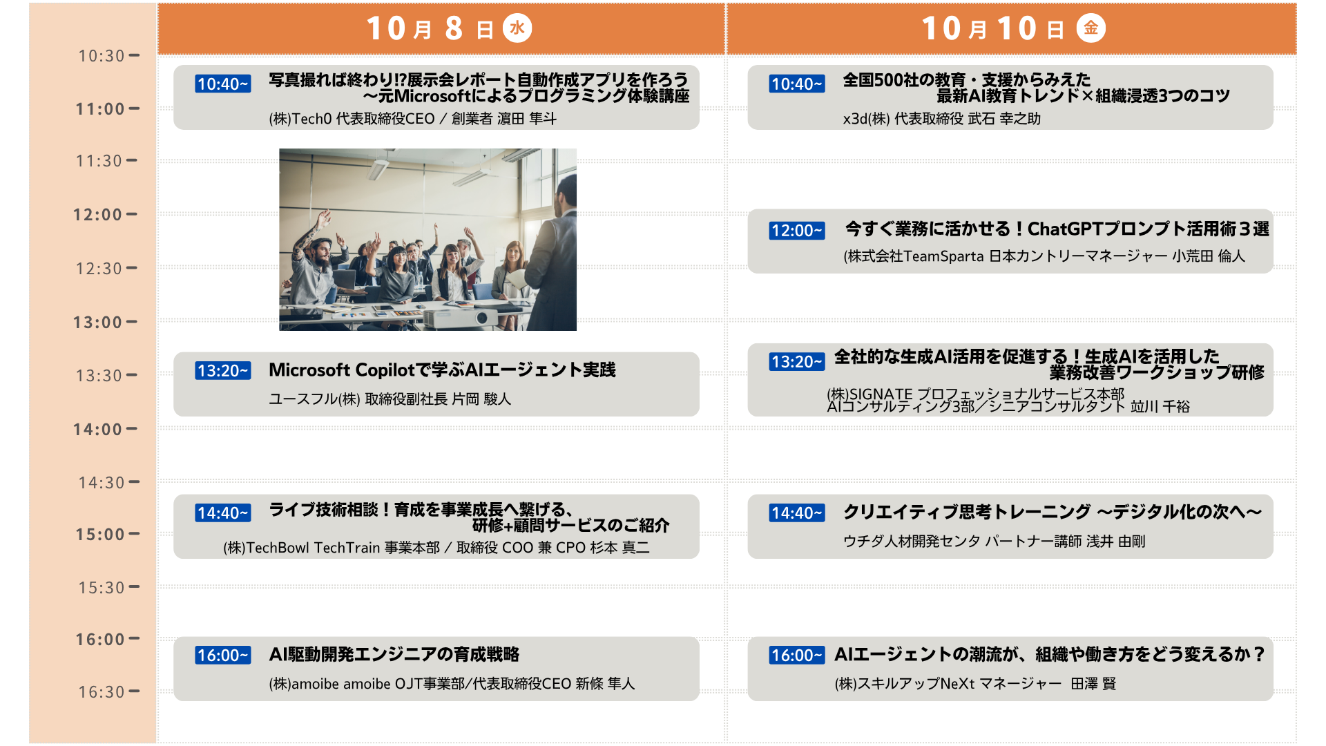 DX推進担当や人事研修担当の方に向けた特別セミナーです。Microsoft Copilotを活用し、「ハンズオン形式」でAIエージェントを実際に構築いただきます。PCをご持参いただくことで、自らの手を動かしながら操作感を体験し、DX推進に必要な実践スキルを習得できます。AIを業務にどう活かせるかを具体的に理解できる内容となっており、明日からの実務に役立つヒントを得られます。